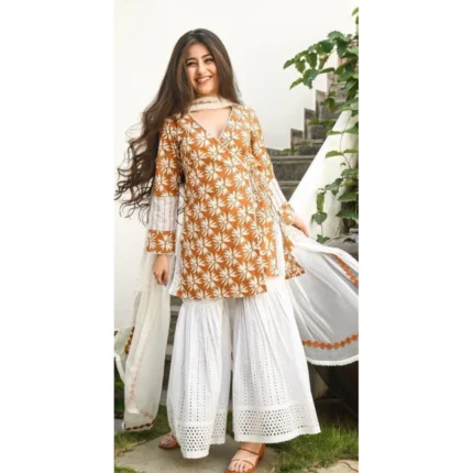 Generic Women’s Procin Print Cotton Angrakha Pattern Kurti With Lace And Tassel Details Set (Mustard Yellow)