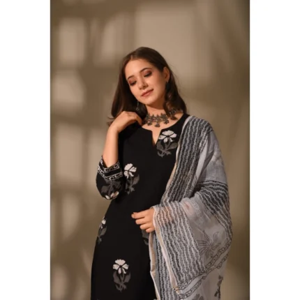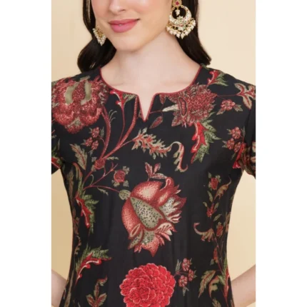 Generic Women’s Casual 3/4th Sleeve Floral Print Cotton Kurti Set (Black)