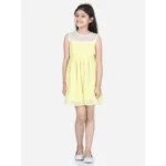 Generic Girl’s Polyester Dobby Floral Printed Sleeveless Round Neck Dress (Yellow)