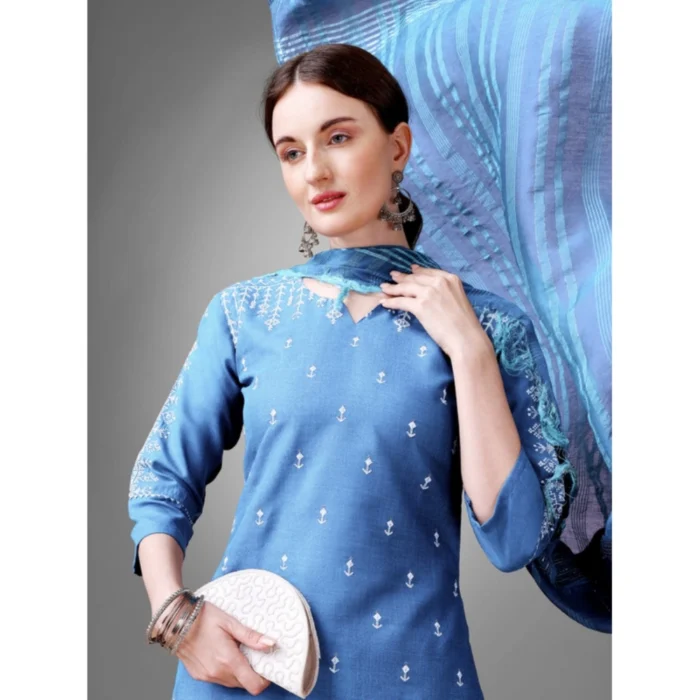 Generic Women’s Casual 3-4 th Sleeve Embroidery Cotton Kurti Pant Dupatta Set (Sky Blue)