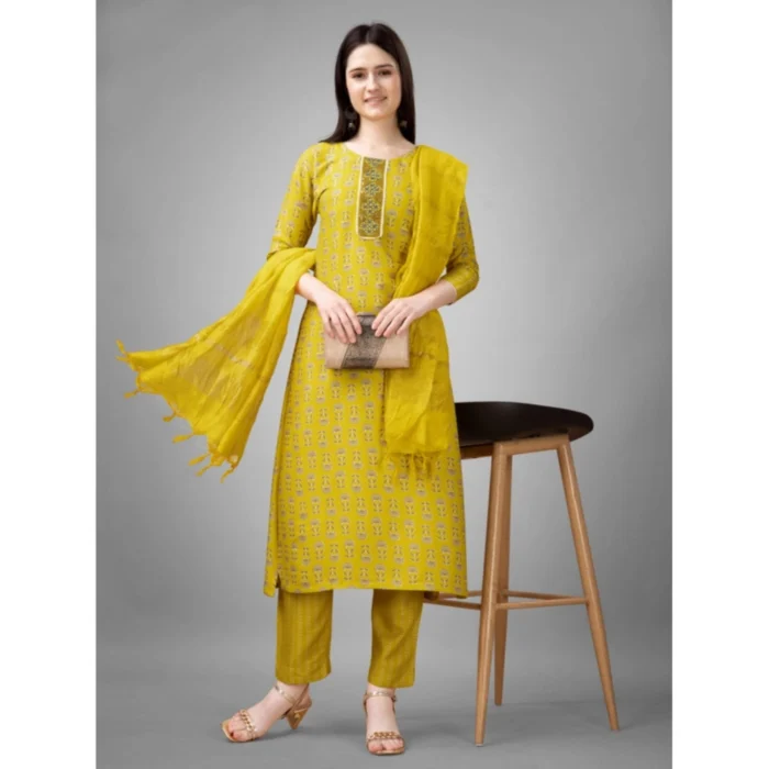 Generic Women’s Casual 3-4 th Sleeve Embroidery Rayon Kurti Pant Dupatta Set (Yellow)