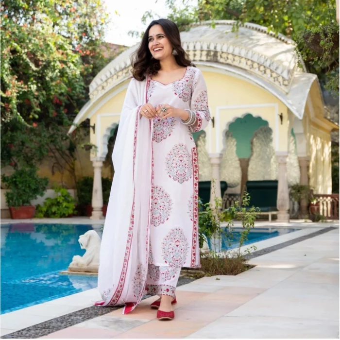 Generic Women’s Casual 3/4th Sleeve Floral Print Cotton Kurti Set (White)