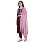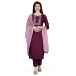 Generic Women’s Silk Blend Embroidered 3-4 th Sleeve Round Neck Kurti With Pant Dupatta Set (Purple)