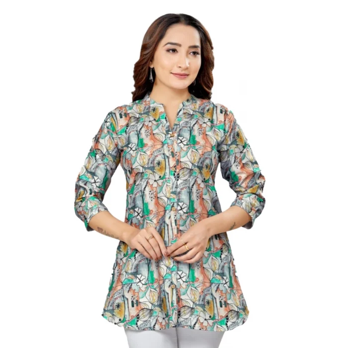 Generic Women’s Quarter Sleeve Faux Crepe Printed Short Kurti Tunic Top (Color:Blue)