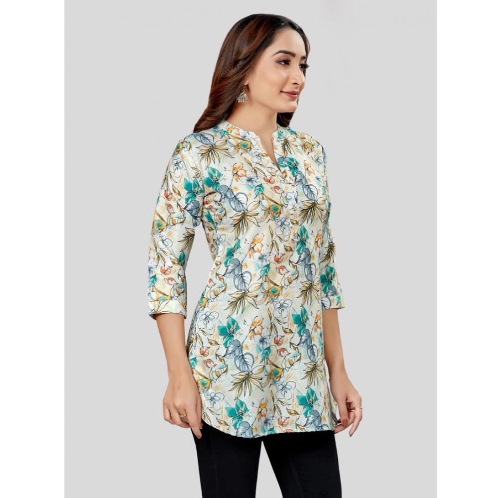 Generic Women’s Quarter Sleeve Faux Crepe Printed Short Kurti Tunic Top (Color:Blue)